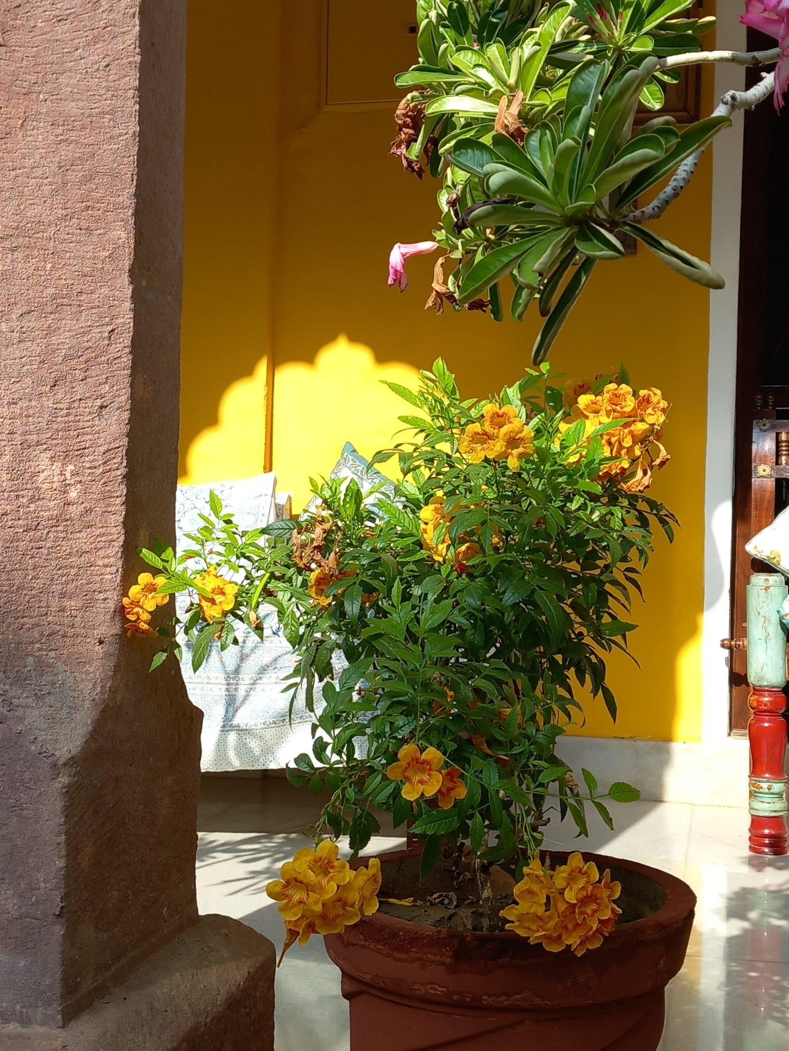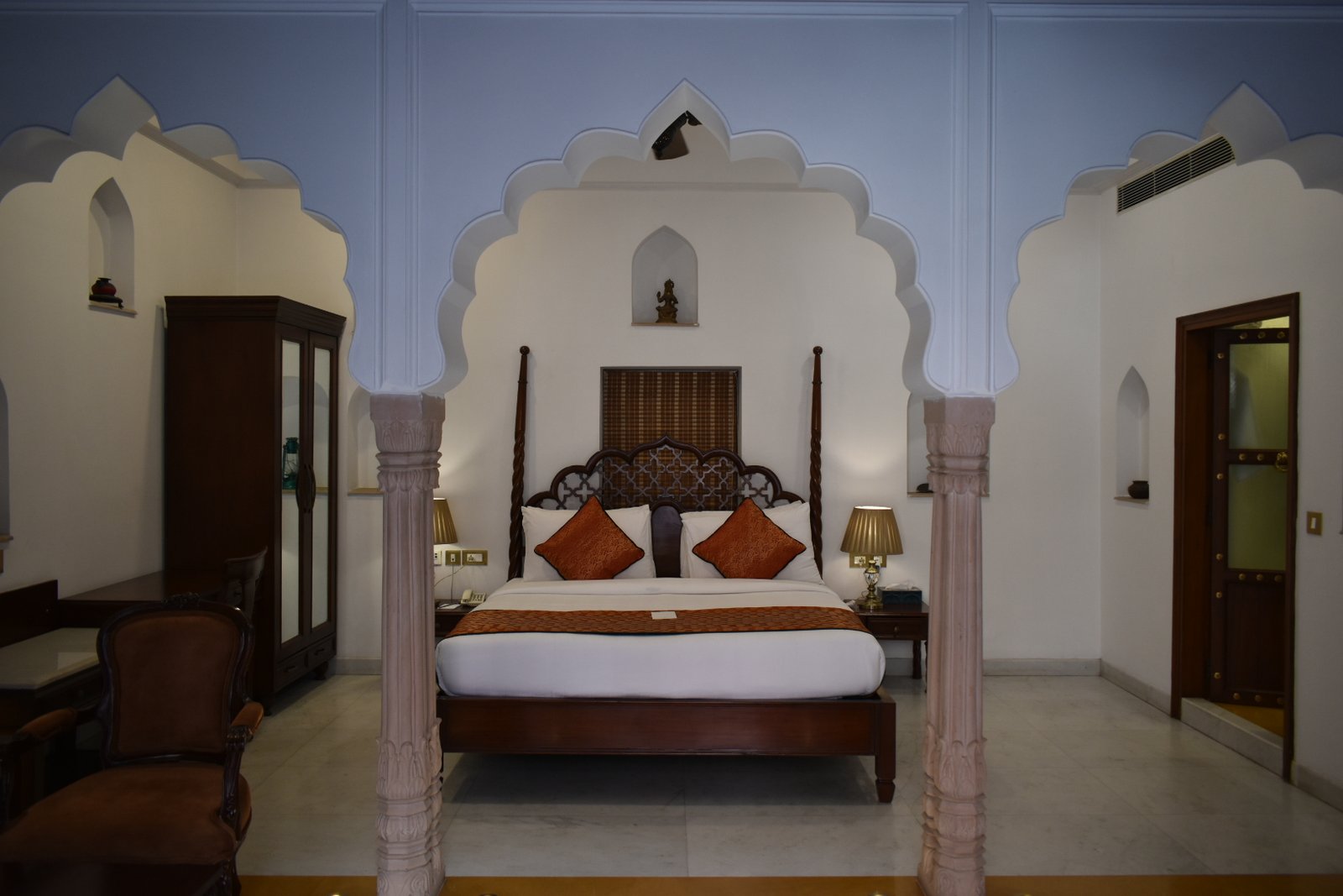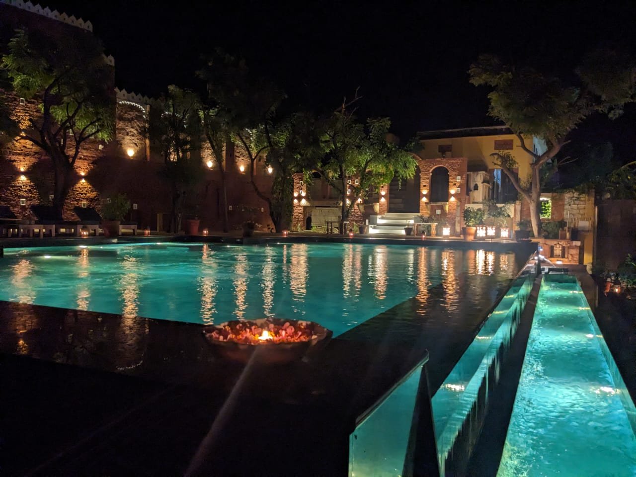 Houses such as these were designed with the climate, and aspect in mind, and so sunlight floods in through the breakfast room windows, large terraces provide opportunity for sitting in the winter sun, and shady courtyards with a profusion of plants and running fountains provide a respite from the summer heat. Well-placed pots of jasmine provide the gentle scents of India as you climb a staircase, flashes of brilliant bougainvillea provide colour and bird boxes in walls, providing refuge to parakeets and owls and the family dogs welcome you each morning. Rajasthan loves colour and this is a profusion of colour and culture, it is bright, almost vibrant in places, yet and elegant and homely without being either garish, or unnecessarily chic. Naturally there have been some modern additions, beds which are huge, bathrooms you could hold a party in, and rooms are never just a simple bedroom with ensuite. I refuse to say more.