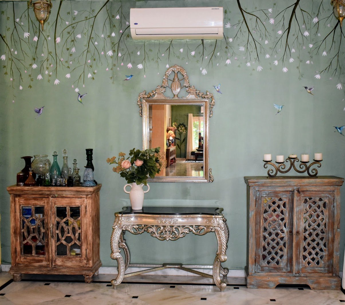 ‘Who did all the art work? I asked gazing at the walls beautifully adorned with storks and sun birds,
