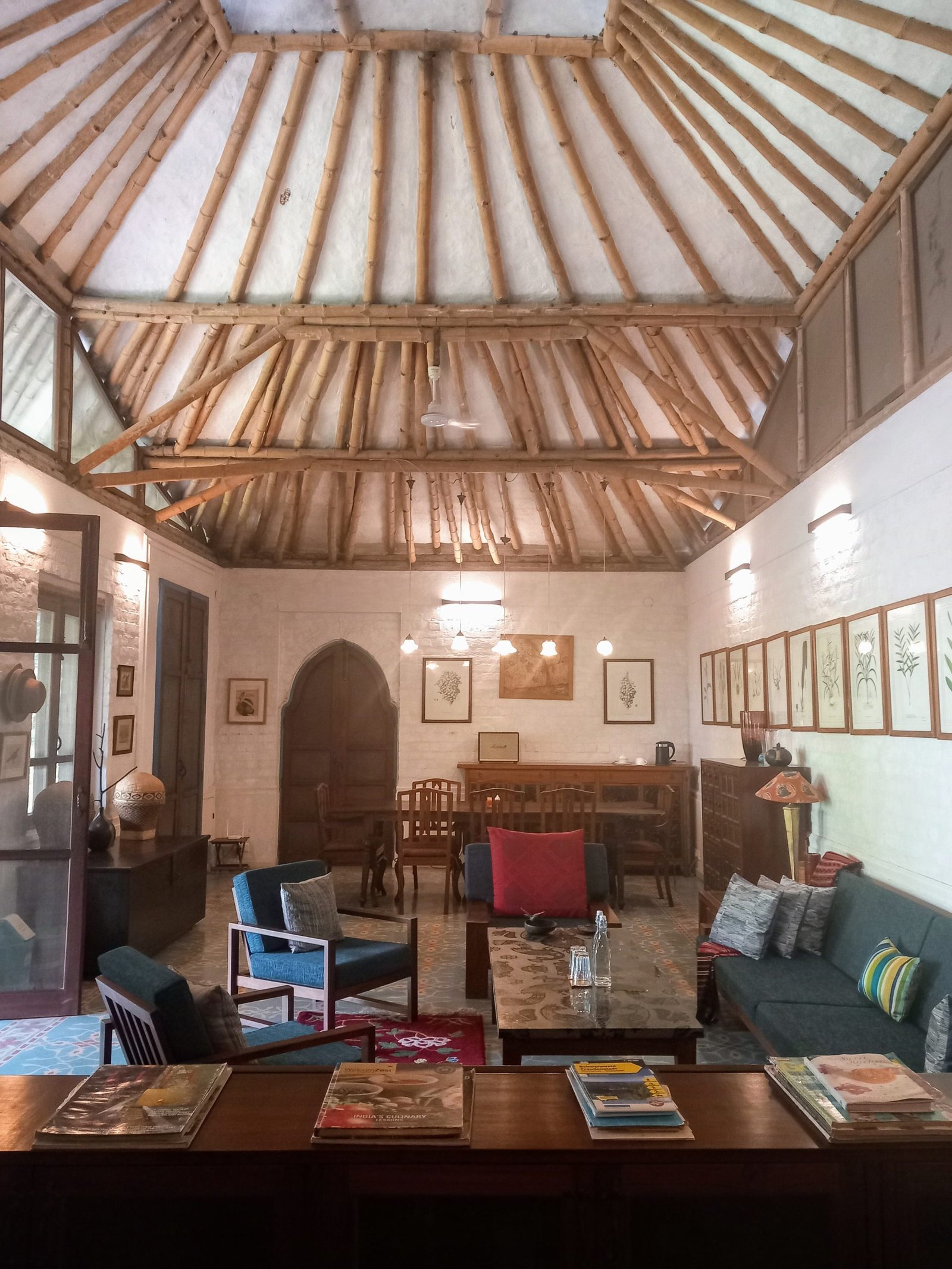 This gives you some idea as to his thought process, conserving tangible and non-tangible heritage through traditional mediums. His home is where he could focus on projects he was either simply passionate about, thought would be fun or just stumbled upon. A traditional Keralan home that was going to be destroyed was transported here and rebuilt brick by brick. A collaboration with renowned architect Simon Velez, renowned for his astonishing bamboo creations, saw the installation of The Bamboo House. The Library is for me, a delightful folly of a space, where efficiency of space in the conventional sense seemed not to be an option. Imagine a building, with two story high (if not more) ceilings, on the ground floor, a lounge space, surrounded by books, lots of natural light, and just one bedroom leading off the first floor. It’s a bookworm’s paradise. One could hole up with a back log of books, or a writing project and just loose all sense of time.